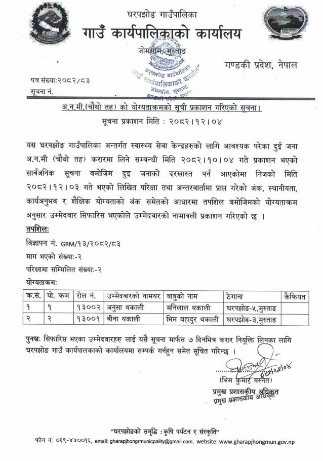 अ.न.मी. (चौथो तह)को योग्यताक्रमको सूची प्रकाशन गरिएको सूचना !