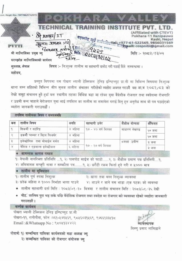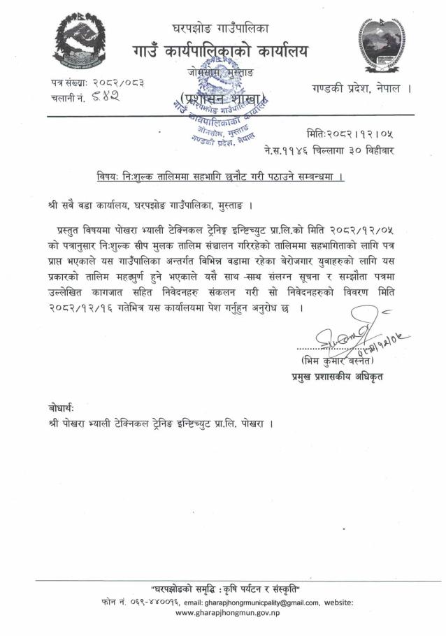 नि:शुल्क तालिममा सहभागी छनौट गरी पठाउने सम्बन्धमा ।