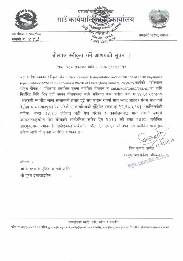 बोलपत्र स्वीकृत गर्ने आशयको सूचना!