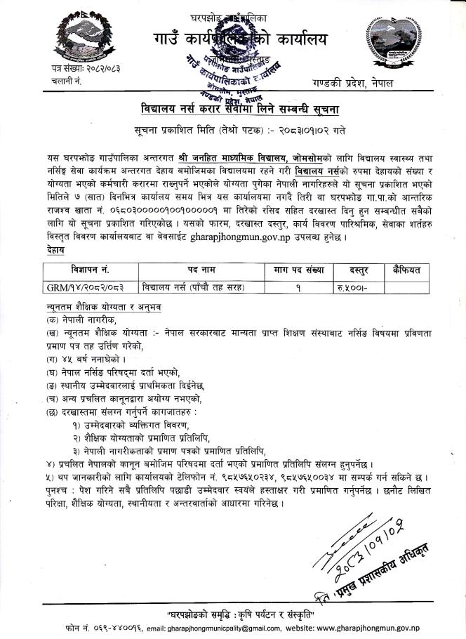विद्यालय नर्स करार सेवामा लिने सम्बन्धी सूचना !