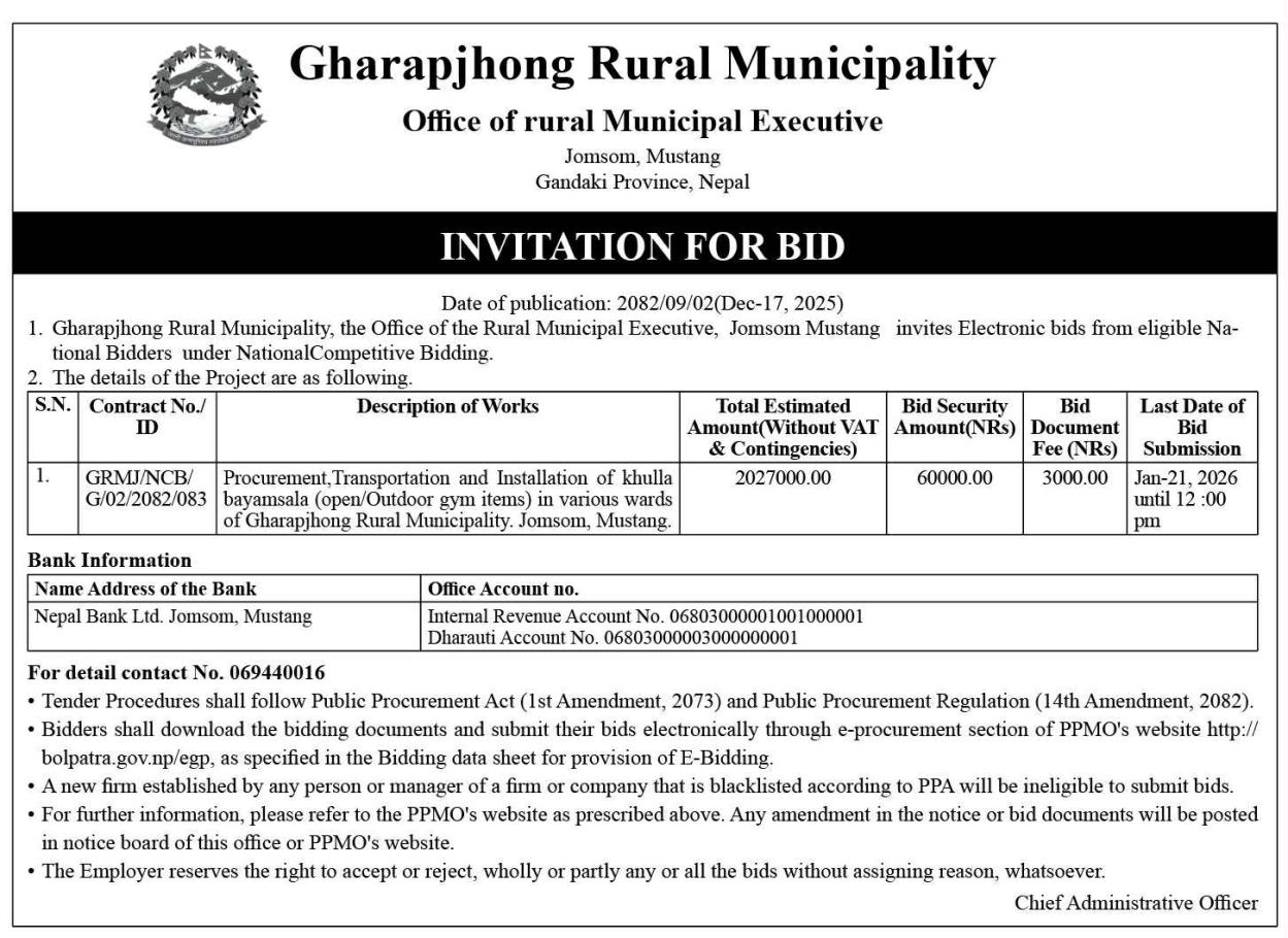 Invitation for Bid (Procurement Transportation and Installation of Khulla bayamsala (open/outdoor gym items) in various wards of Gharaphong Rural Municipality, Jomsom, Mustang